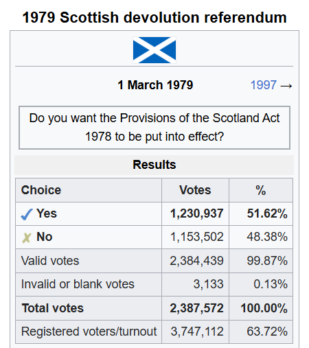 A post-legislative referendum was held in Scotland in 1979 to decide whether there was a sufficient support for a Scottish Assembly proposed in the Scotland Act 1978 among the Scottish electorate. This was an act to create a devolved deliberative assembly for Scotland.